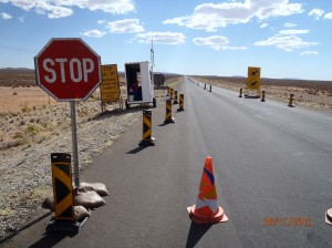 Along the way are stop/go signs where road engineers are resealing the tarmac. I stop by one and look ahead. The shimmering tarmac resembles a stagnant river with a blurred haze rising hovering above it. Further along the Kalahari Desert, temperatures soon increased to over 40’C making it an exhausting journey. I pre-empt each gust of wind and lean in to them hoping it’s the right direction, though sometimes leaning with the wind causing the bike to sway from one side of the road to the other as I fight to control the Livingstone. I close my visor, its cooler that way, but the hot air still enters from around the chin area. My eyes are sore and my lips chap because of the hot wind drying them out. It’s that hot, I ride with one eye closed to prevent them both from drying, and then swap to the other whilst trying not to wet my lips. There’s absolutely nothing along the Kalahari Desert apart from a small town and petrol station every two hundred miles or so.